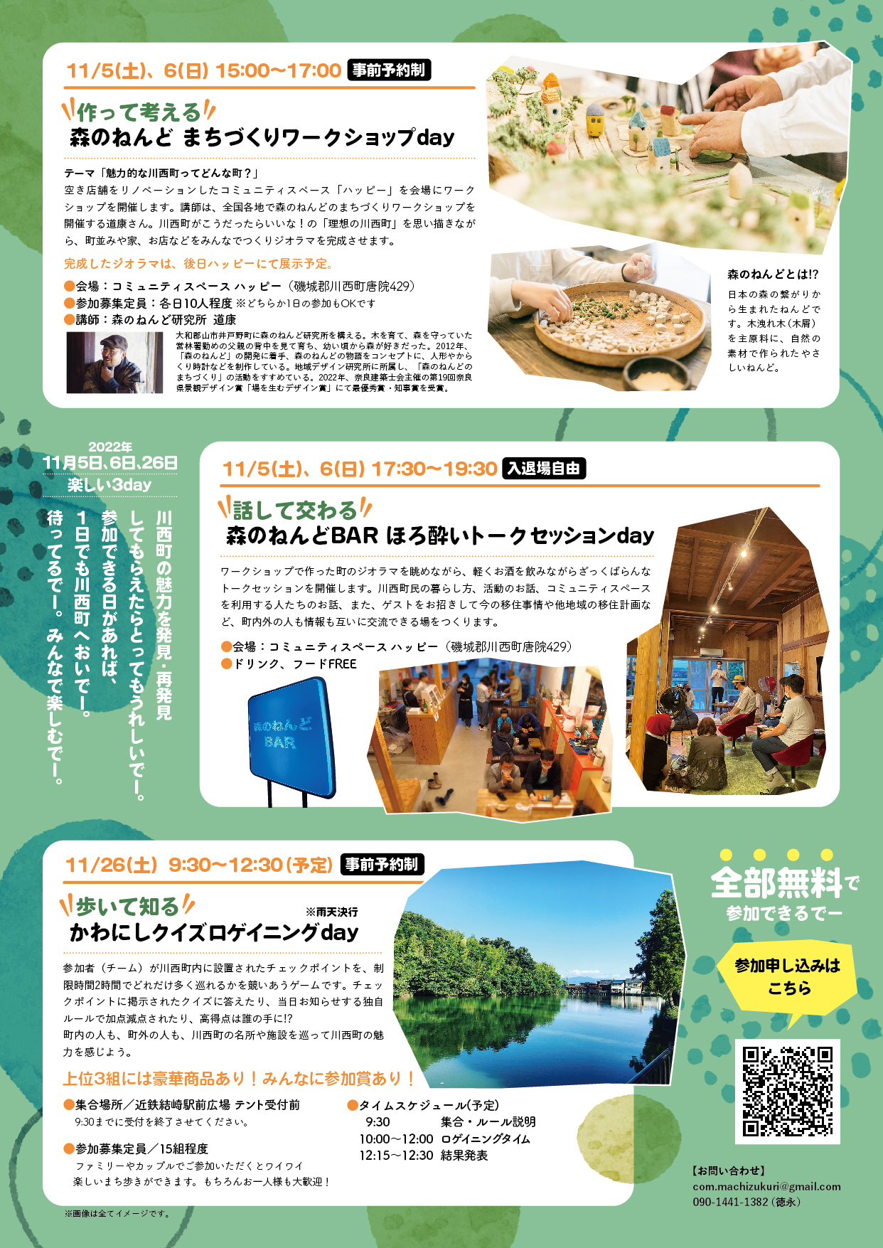 全て参加費無料です。 ①作って考える 森のねんど まちづくりワークショップ 日時:11/5(土)、6(日)15:00~17:00(事前予約制) 会場:コミュニティスペース ハッピー    (磯城郡川西町唐院429) 参加募集定員:確実10人程度    ※どちらか1日の参加でもOKです 講師:森のねんど研究所 道康さん ②話して交わる  森のねんどBAR ほろ酔いトークセッションday 日時:11/5(土)、6(日) 17:30~19:30(入退場自由) 会場:コミュニティスペース ハッピー    (磯城郡川西町唐院429) ドリンク、フードフリー ③歩いて知る かわにしクイズロゲイニングday 日時:11/26(土)9:00~12:30(予定)(事前予約制・雨天決行) 集合場所:近鉄結崎駅前広場 テント受付前 9:30までに受付を終了させてください 参加募集定員:15組程度 もちろんお一人様も大歓迎! タイムスケジュール(予定) 9:30集合・ルール説明 10:00~12:00 ロゲイニングタイム 12:15~12:30 結果発表 >> 事前予約制のイベント申し込みフォーム 問合せ >> MAIL 090-1441-1382(担当/徳永)