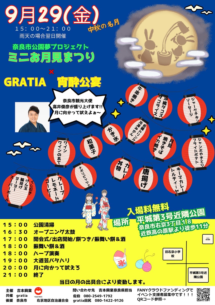 【奈良市】2023年9月29日(金)イベント「奈良市公園夢プロジェクト×gratia ミニお月見まつり×宵酔公宴」