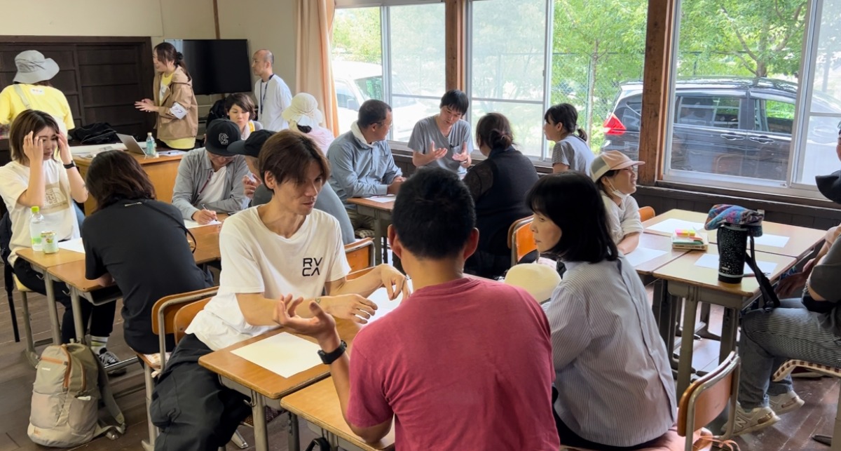 最後にかえでの郷ひららに戻ってきて、今日1日学んだことや、この森林との共生が自分たちの20年後、30年後の未来にどう関わってくるのかをグループで共有しました。子どもだけでなく、参加した保護者同士でもディスカッションしました。