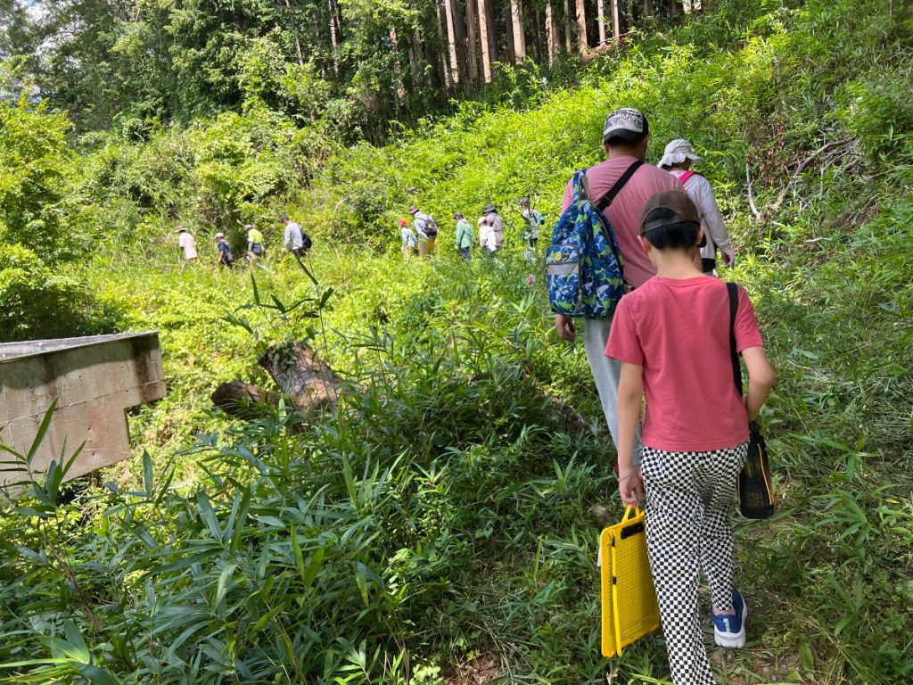 人の手が加えられた山の遊歩道を歩き、自然と人が共生するために手入れが必要であることを感じてもらいました。