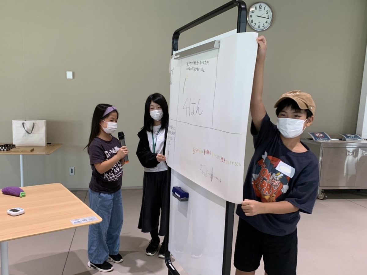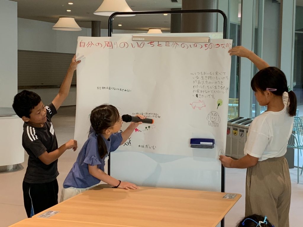 最後に、自分たちで作ったソーセージを食べてみて「いのちをいただくこと」でどう感じたのか、「自分の周りのいのちと自分のいのちの繋がりをどう考えたのか」を考え、グループで考えを共有し、他のグループにも発表形式で伝えました。