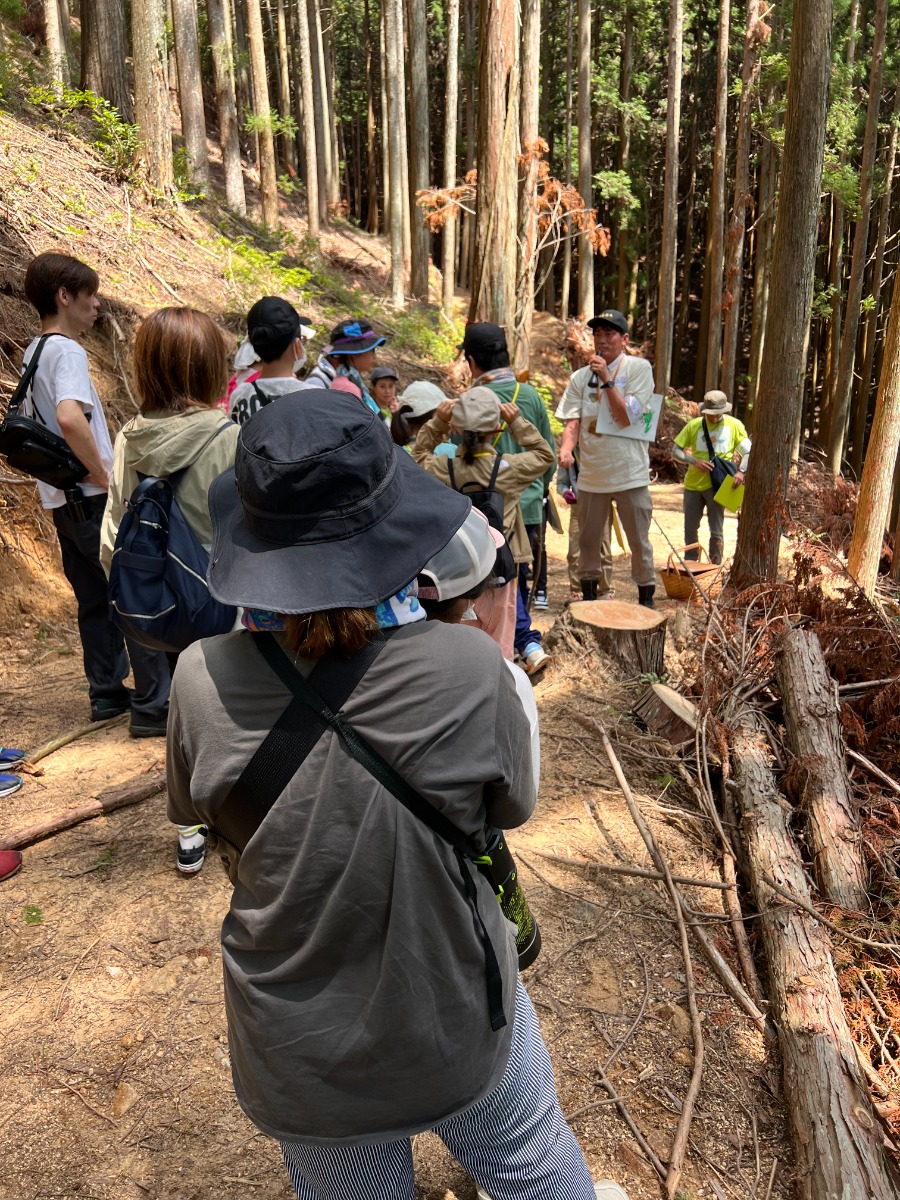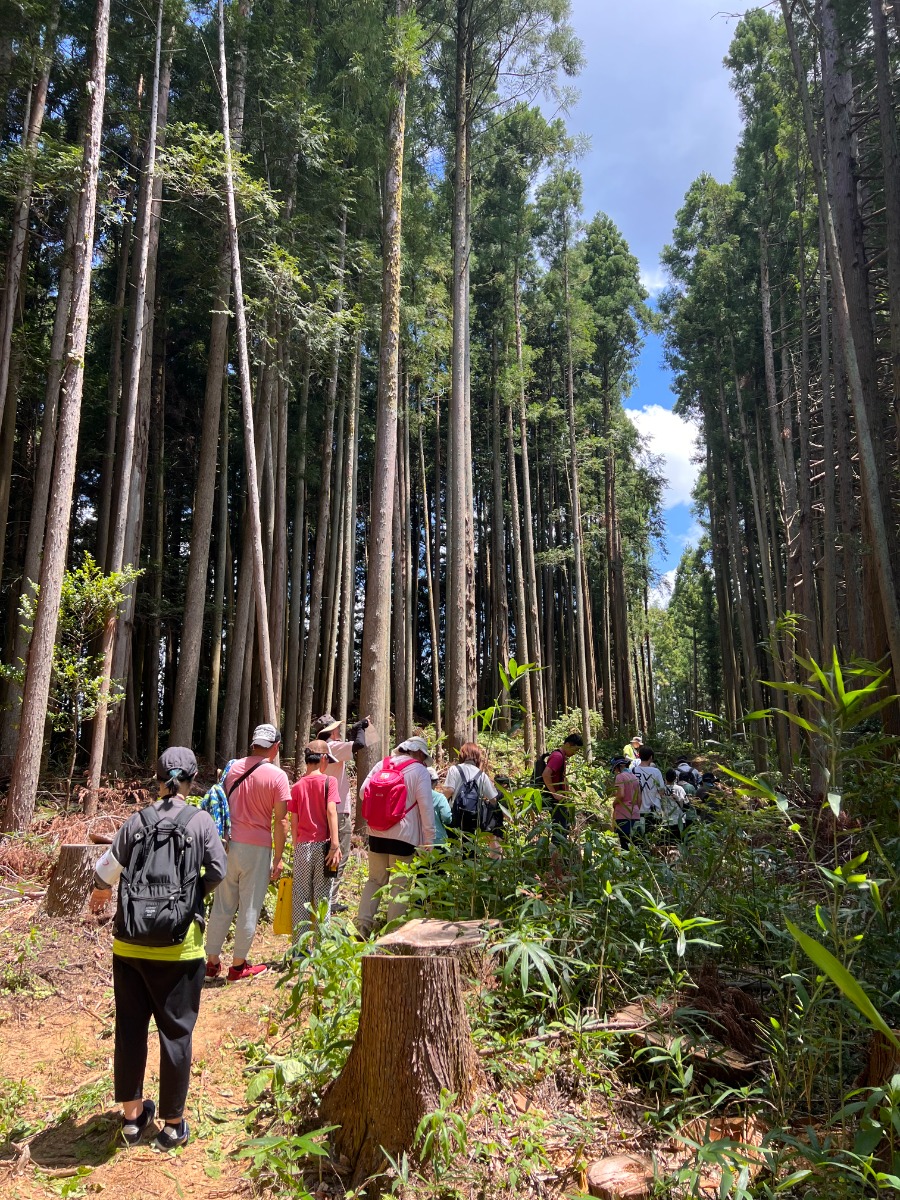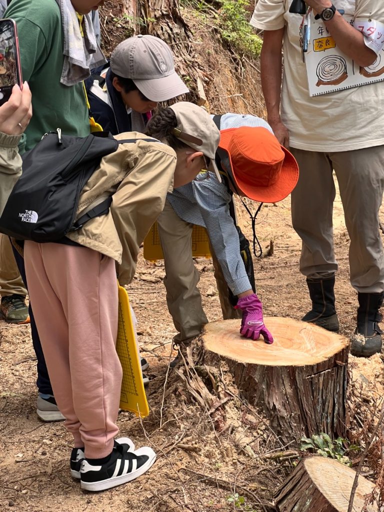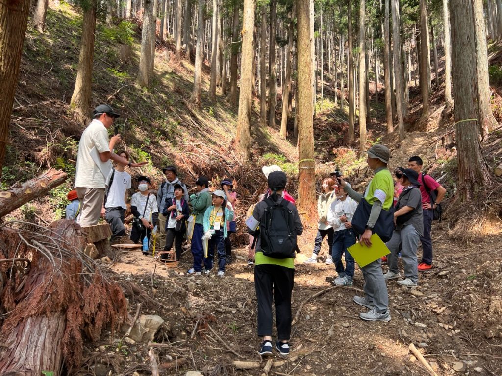 森を訪れたグループでは、周りに豊かな木々に囲まれながら、今の日本の森の中は、杉や檜の木が人工林として植えらていることや、木を切っても植えないために自然のバランスが壊れていることで土砂災害や獣害の被害につながっていることを学びました。