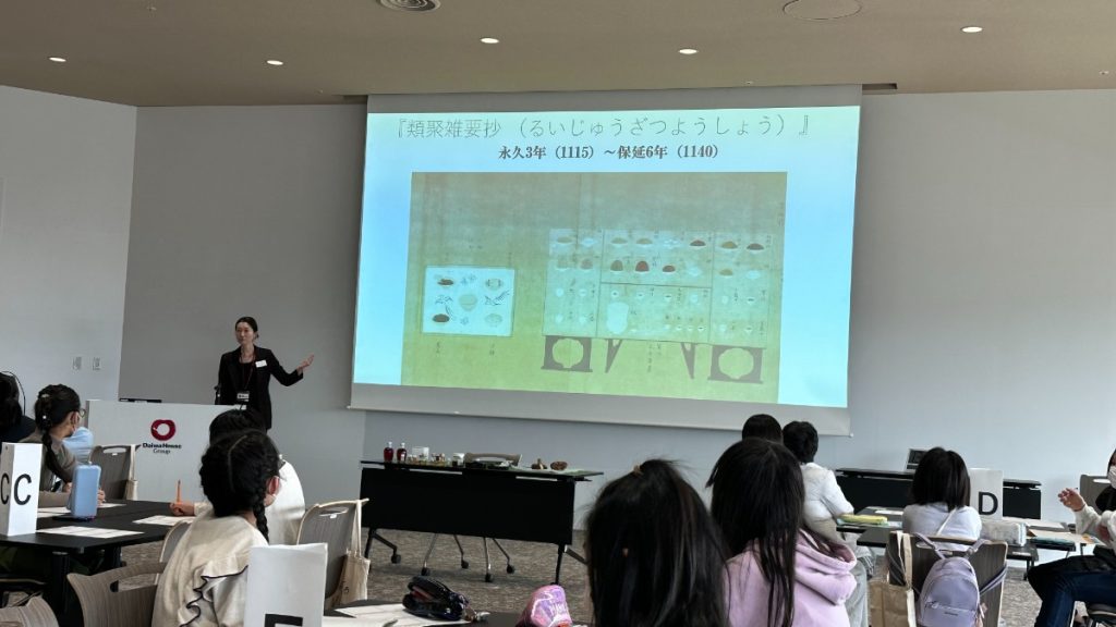 平安時代の天皇や貴族の食事、お菓子はどんなものがあったのかを説明してもらい、当時のお菓子にかかせない甘葛煎(あまづらせん)の歴史について学びました。