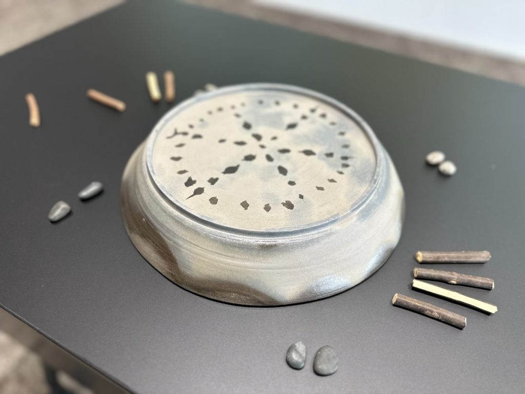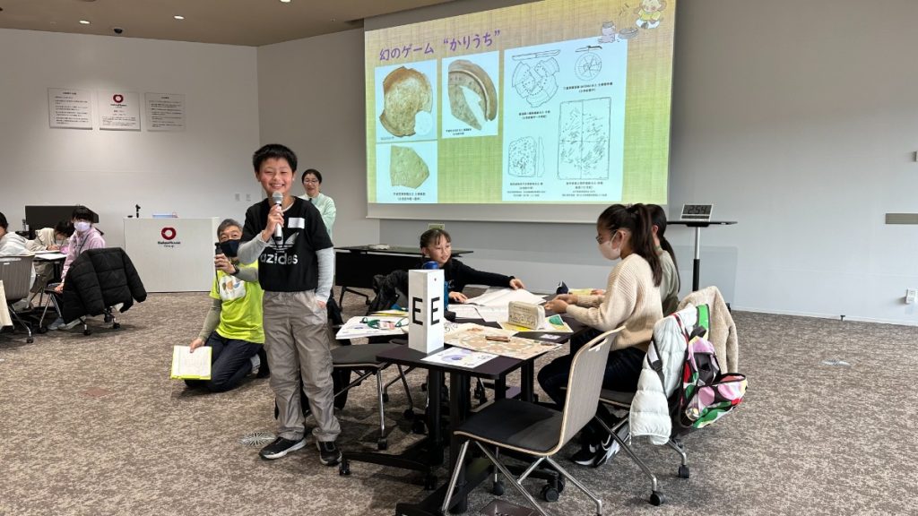 一般人が遊んでいた、”かりうち”について、出土品から盤を復元していく過程を説明しました。