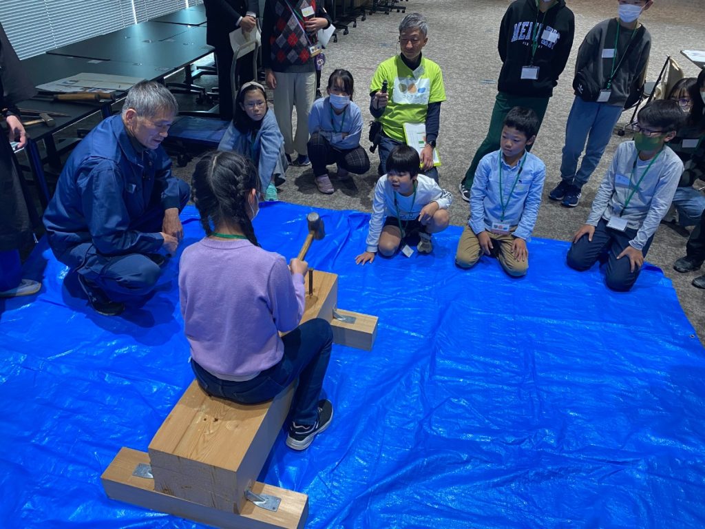 体験した子どもたちは、「思ったより重かった」、「釘に当てるのが難しい」等、楽しそうに感想をシェアしていました。
