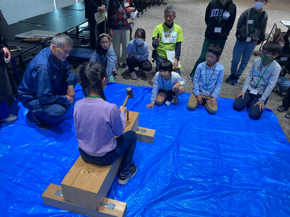 お友達が打った釘がどこまで刺さっているか、どこまで打てば木を貫通するか、体験が終わってからも下から覗き込みたくなるほど、ワクワクだ止まらない様子でした。