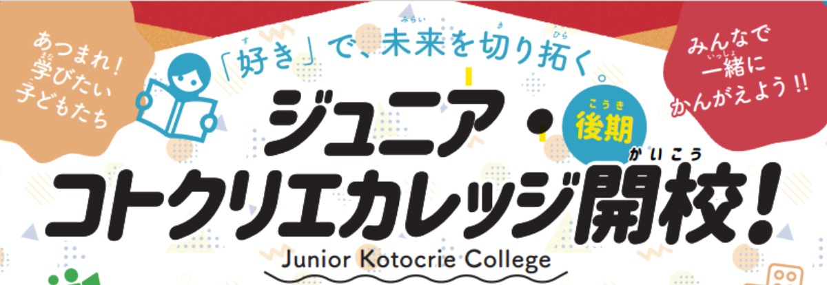 ジュニア・コトクリエカレッジは、子どもたちが「好き」と向き合い、未来を切り拓く5つの教養をテーマに、地域や地球の様々な課題を理解し、生き抜く力のヒントを新しい仲間と身につけてほしいという想いで企画されています。