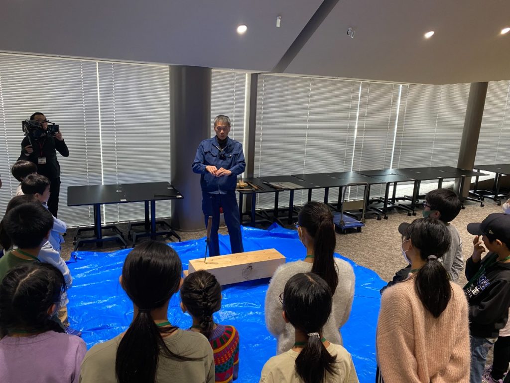 実際に石井棟梁が釘打ちのやり方を子どもたちに披露しました。