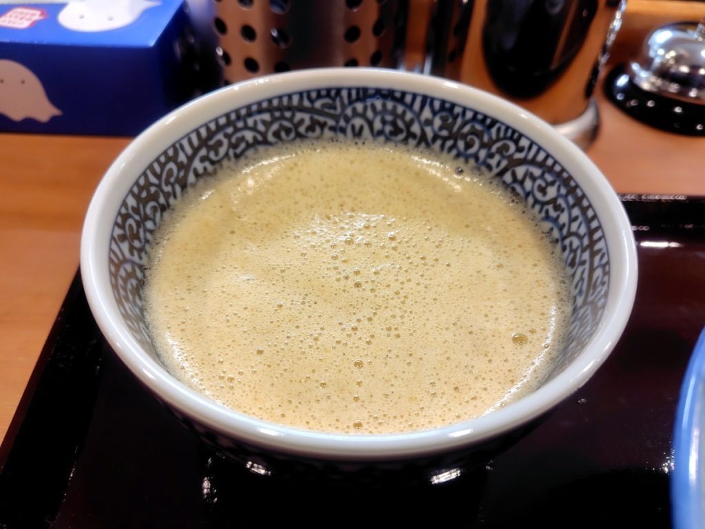 ブレンダーで泡立てられた鶏豚骨魚介の白湯スープ。