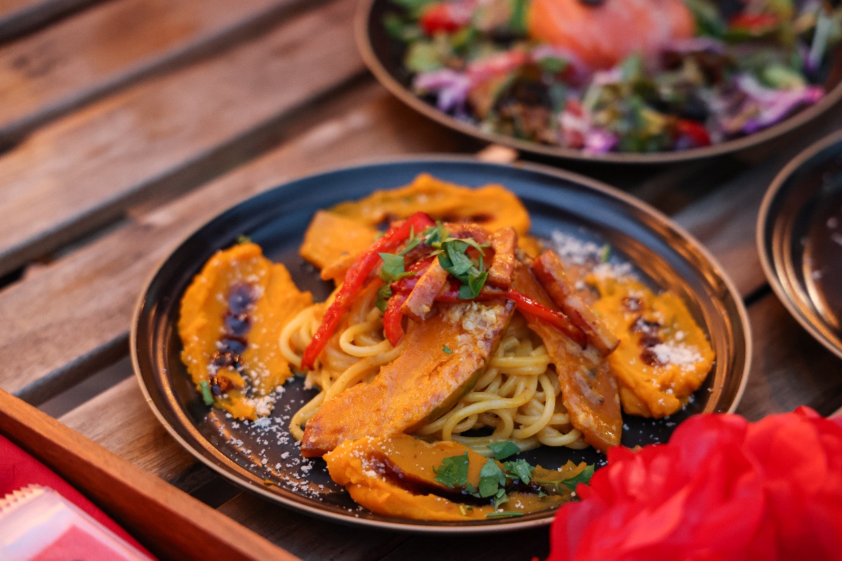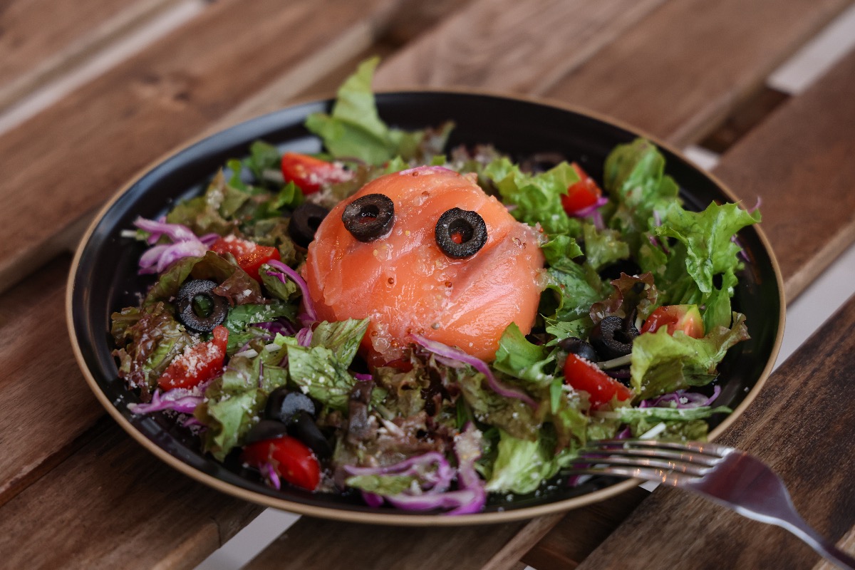 サーモンとモッツァレラのサラダは、まるでかぼちゃのおばけが顔を出したような遊び心ある盛り付けで、最初の一皿から笑顔に。