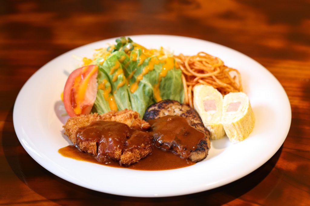 洋食はボリュームたっぷりのトンカツ&ハンバーグセット。