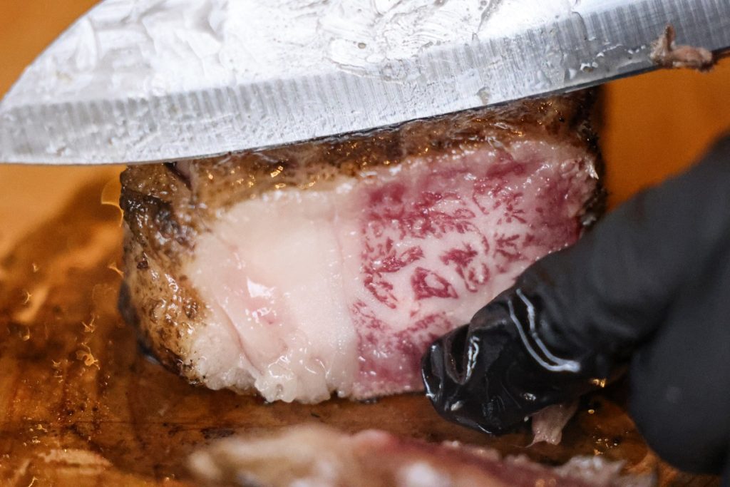 大和牛のサーロインはブロックで焼いて、カットしていただきます。