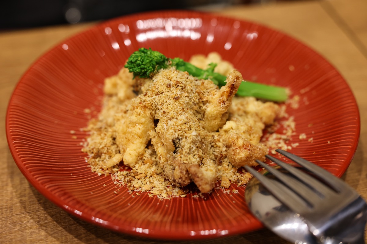 香味野菜の香りを極限まで引き出し、パン粉とイカの食感を楽しむ一品。