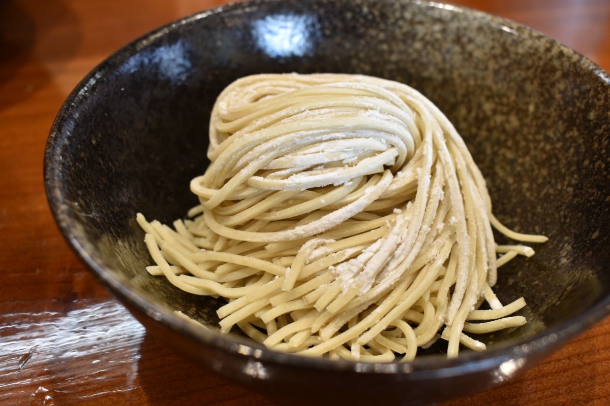 限定麺は、細麺と中太麺の中間くらいの平打ち麺で、滑らかでモチモチとした食感が特徴。