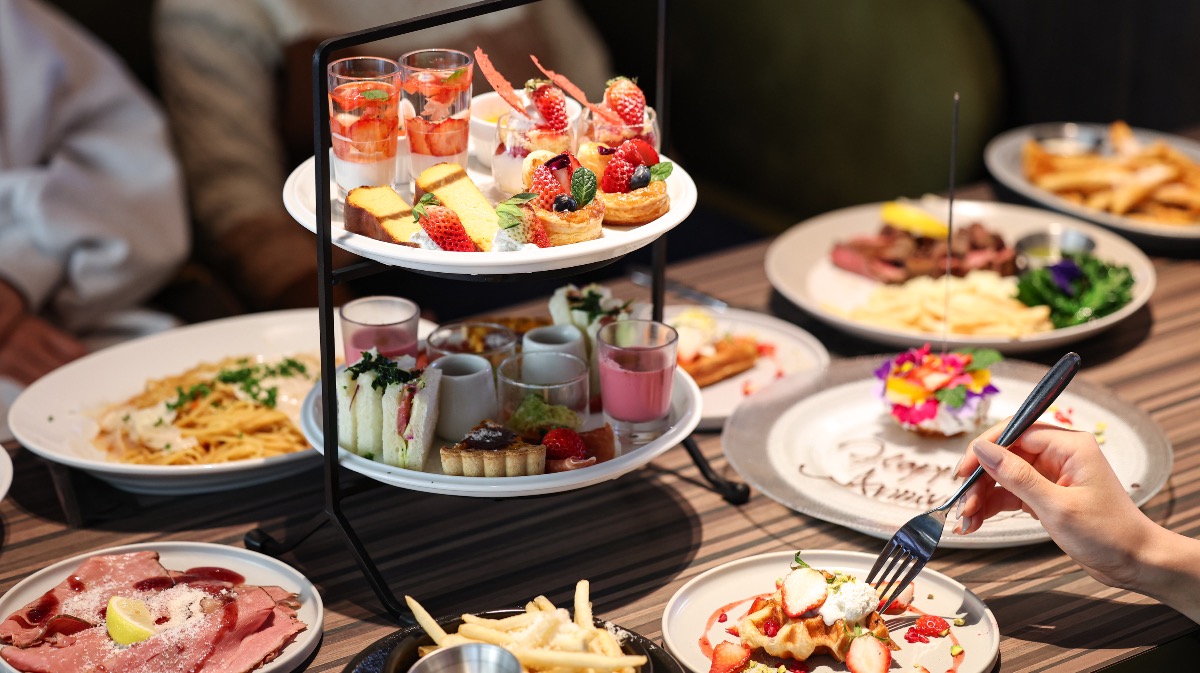 ティースタンドとクロッフルと世界一の長さを誇る10mのビバレッジバー(ドリンクバー)の利用にフライドポテトもついてきます✨