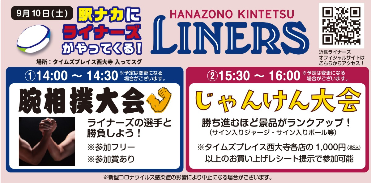 グルメ店で割引になるほかに、9月10日(土)には花園近鉄ライナーズの選手たちが訪れてイベントが行われる。