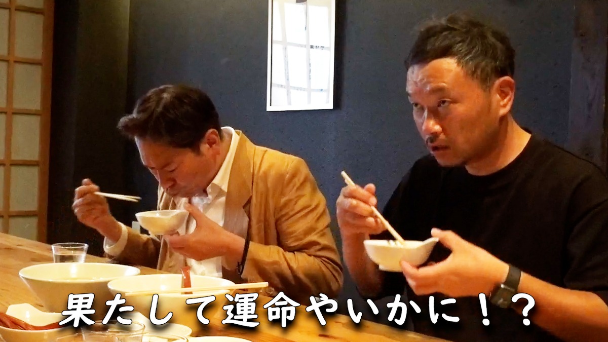 今回試食するのは『よ~いドン!』『魔法のレストラン』に度々登場するグルメイベントプランナーの稲田敏博氏、今回オープンする『杵の音』『丼と飩』など奈良県で店舗を展開する株式会社風神の社長、廣渡史朗氏。