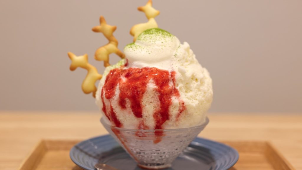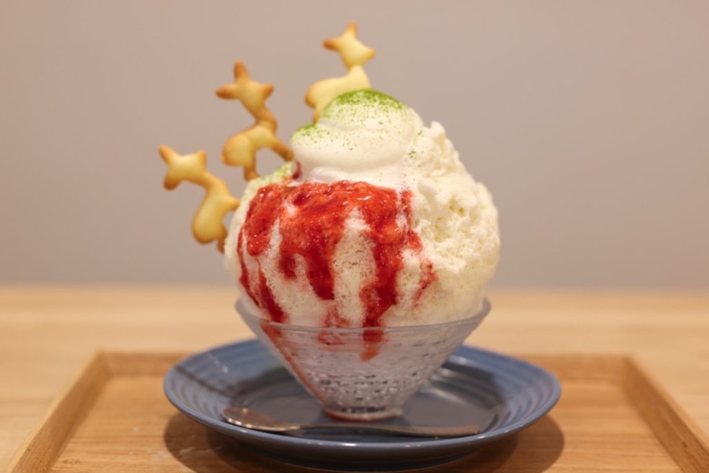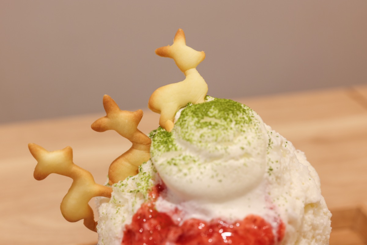 かき氷の上には、岩田健康茶園の有機栽培大和茶パウダーとMAHOROWA鹿クッキーを添えてさらに贅沢なかき氷に。
