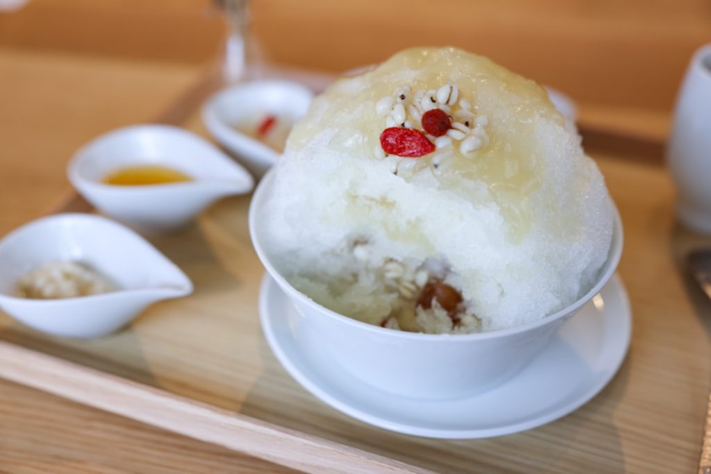 かき氷の中には、甘く煮詰めた薬膳食材のはとむぎ、ナツメ、クコの実、ハスの実、龍眼肉が入っていて食感も楽しめますよ。
