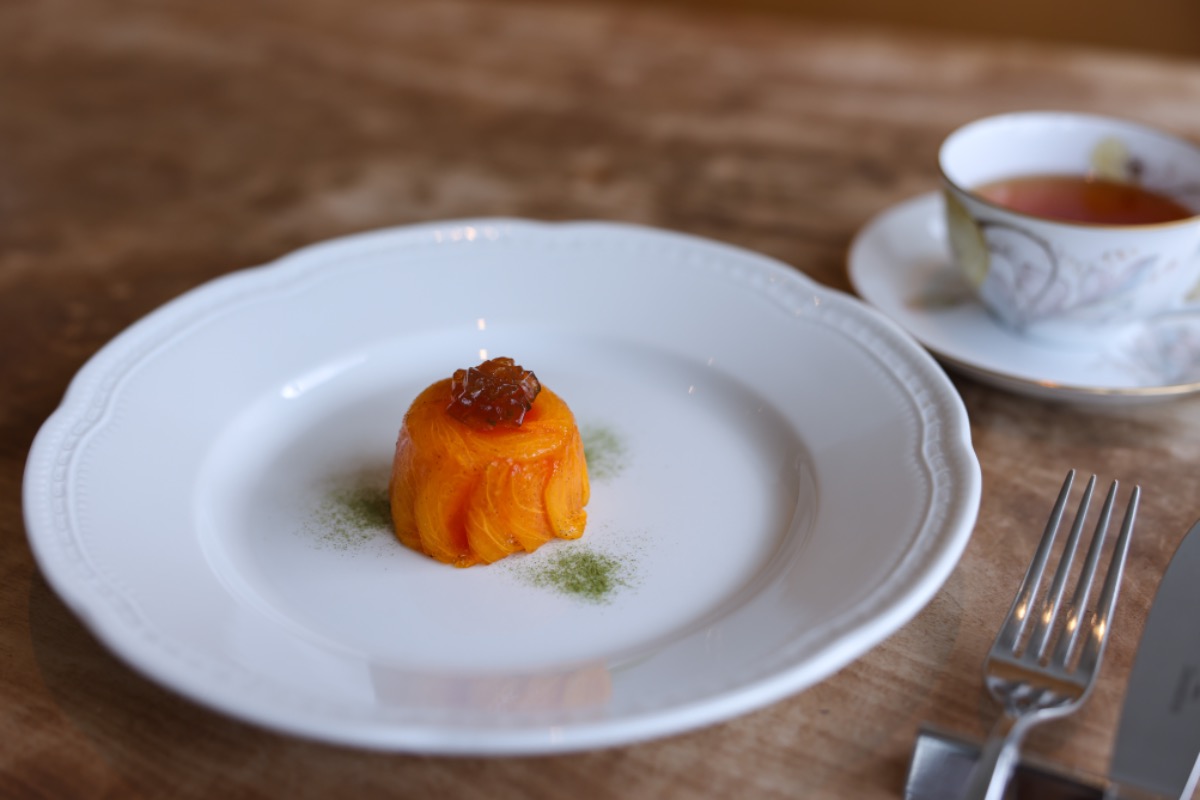 仕上げのアクセントには、シェフお気に入りにの調味料「柿の専門 いしい」の柿酢のジュレ。