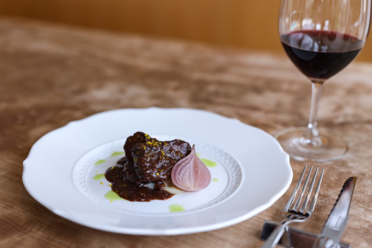 大和橘のピールを削って、柑橘の香りでより一層スパイスの香りを引き立て、軽やかに仕上げるボルゴ・コニシのグーラッシュに、今季は益田農園の「大和当帰(ヤマトトウキ)」を削って、柑橘の香りでより一層スパイスの香りを引き立て、軽やかに仕上げるボルゴ・コニシのグーラッシュに、今季は益田農園の「大和当季のオイルが加わった一皿。