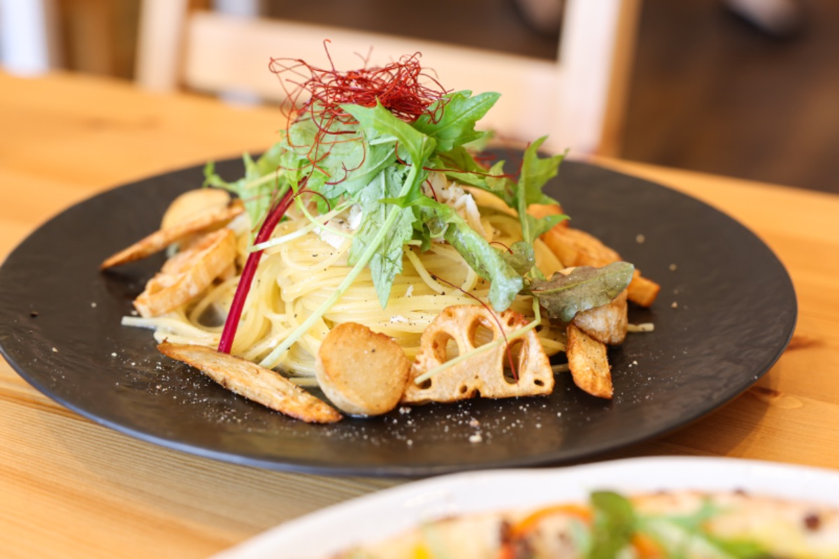 揚げているごぼうと蓮根が香ばしく、オイルパスタのアクセントになっており、フォークが止まらない。