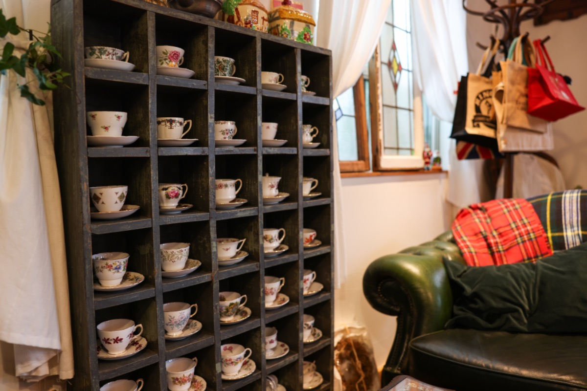 食器を含む店内全て、英国アンティークで統一感があり紅茶を飲む際は、好きなアンティークカップを選べるのもポイント!