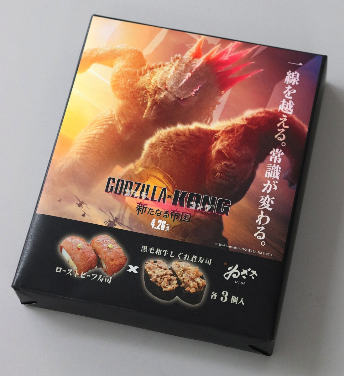 奈良名産の「柿の葉寿司」など名産寿司の製造・販売を「ゐざさ」の屋号で手がける株式会社中谷本舗は、映画『ゴジラxコング 新たなる帝国』とタイアップした「創作 寿司 黒毛和牛しぐれ煮とローストビーフ」を映画公開日の4月26日に販売を開始した。