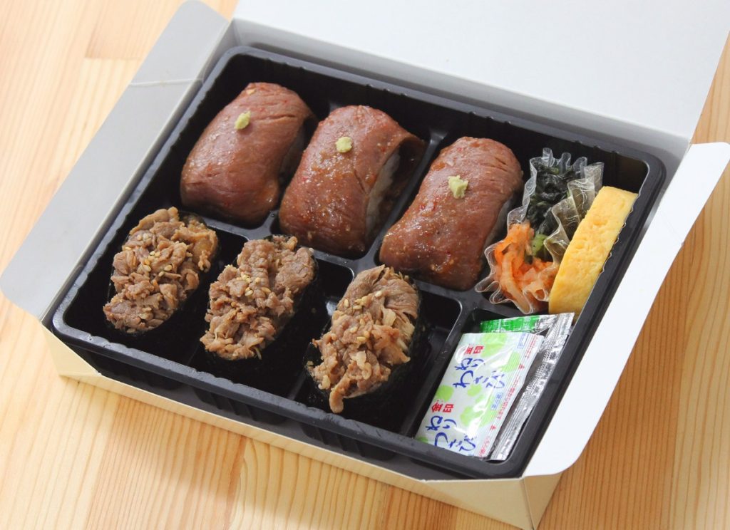 低温調理で柔らかく仕上げたローストビーフに、香味野菜などを使ったタレを和えた「ローストビーフ寿司」と、黒毛和牛を甘辛く 炊いた「しぐれ煮」を使った「黒毛和牛しぐれ煮寿司」が各3個入った詰合せ。