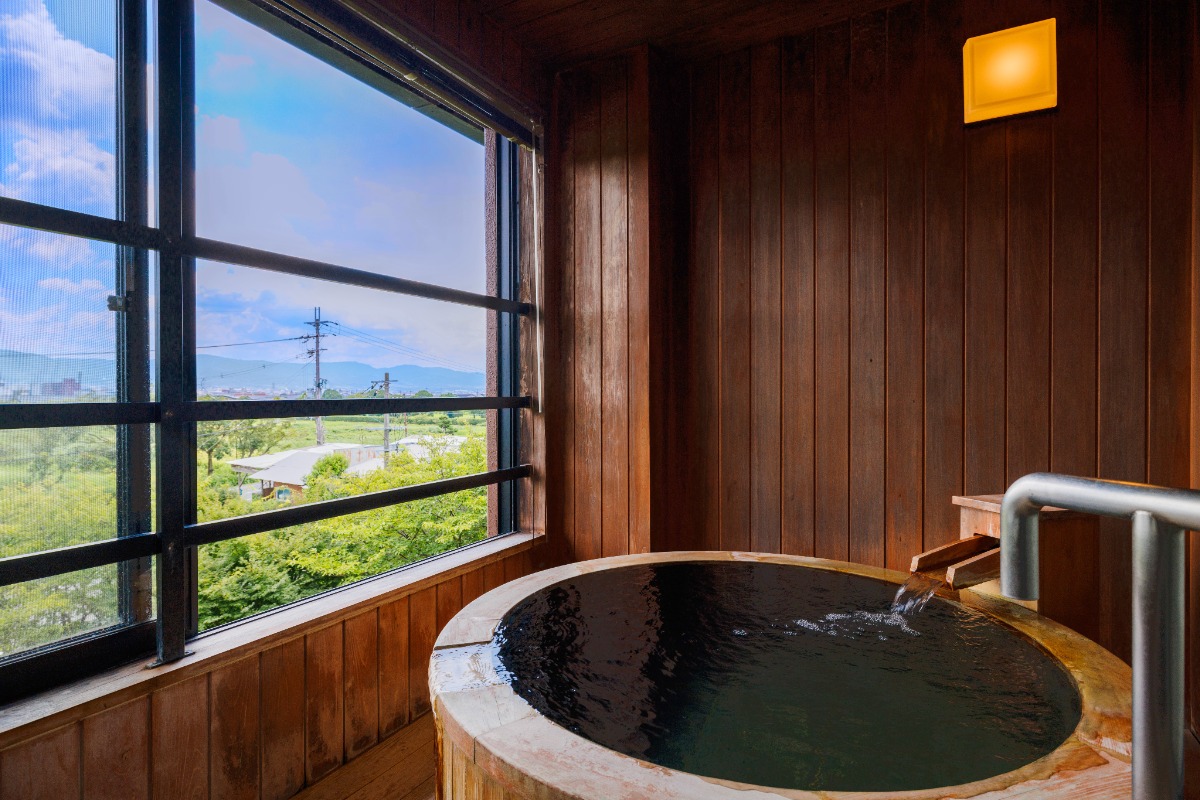 古都奈良をイメージした焼き杉材の内装の内風呂、ゆったり空を見上げながら入れる開放的な露天風呂を堪能!