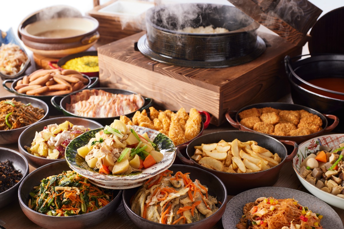 その他、定番のおかずや、奈良県産ヒノヒカリを使用した炊き立てご飯、新鮮なフルーツバイキングなど、全部で約60品の種類豊富なラインナップ!