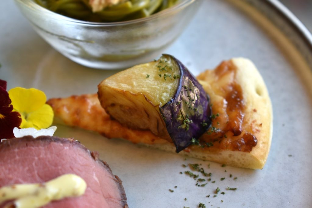 奈良県産大和丸茄子を使ったピッツァ。「フレンチでピッツァ?」とも思うが、そこはご愛敬。実はフランス人はピッツァが大好き。一人当たりの年間消費量ではイタリア人の倍というデータも。