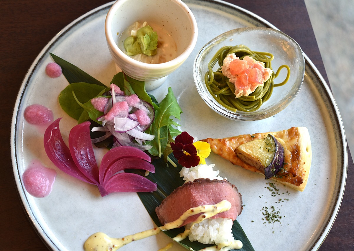 サラダに使われているアーリーレッド(玉ねぎの品種)のマリネやドレッシング、茶そばサラダのトマトやビネガーなど、さわやかな酸味を上手く取り入れることで、酷暑で食欲が減退しがちな中でもすいすいと食べ進めることができる。