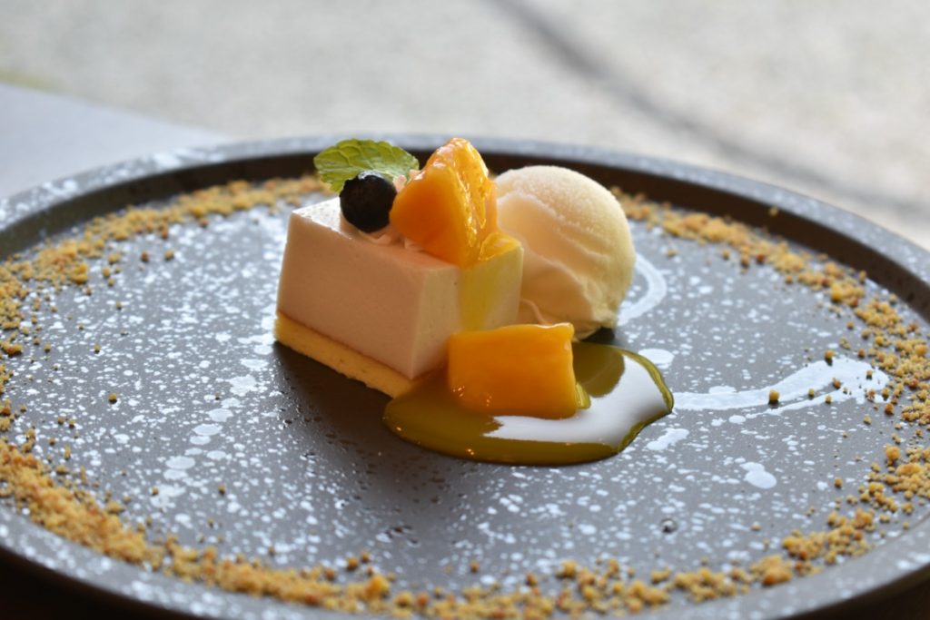 マンゴーの果肉とソースをあしらったアイスクリームとババロアケーキのドルチェ。こちらも爽やかで夏らしい一品。