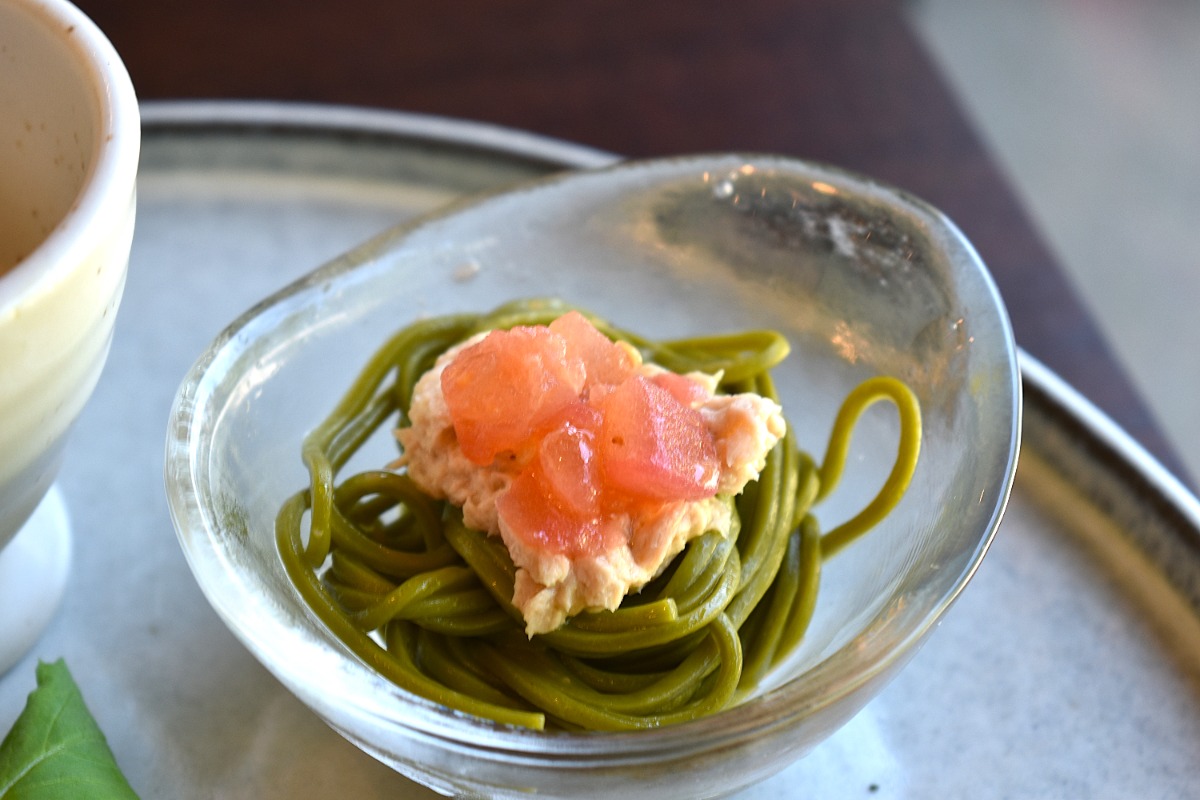 そばとトマト、ビネガー系のソースのマリアージュにアッと驚く。