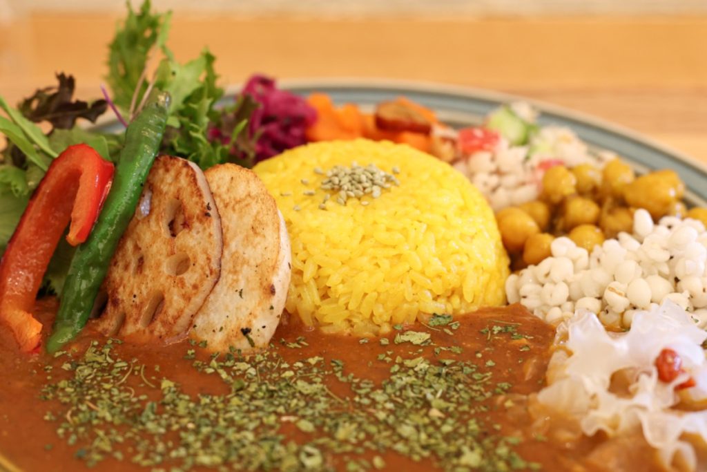 スパイスカレーは、はとむぎ粒や高麗人参など10種類の薬膳素材と、コリアンダーやクミンなど13種類のスパイスを使用した本格的なスパイスカレー!