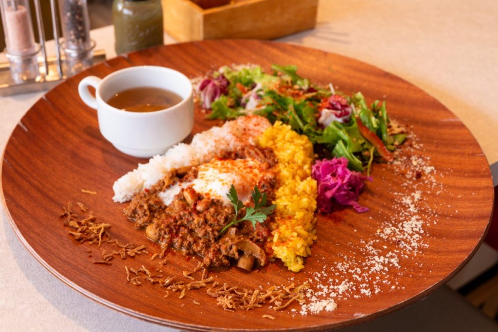 人気メニュー『薬膳キーマカレー』は菊岡漢方薬局監修の薬膳カレー粉から作られており、市販のカレールゥを使うより脂質や添加物が少ない。