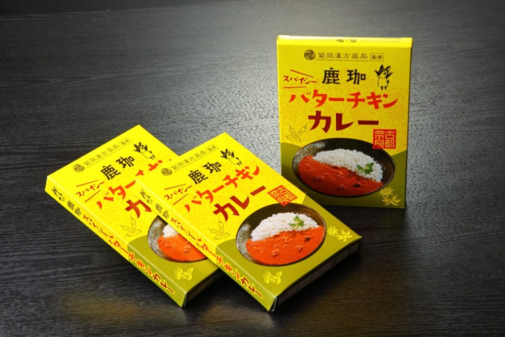 創業840年の菊岡漢方薬局監修のカレー粉を使用したコラボ商品が『鹿珈スパイシーバターチキンカレー』が発売された。