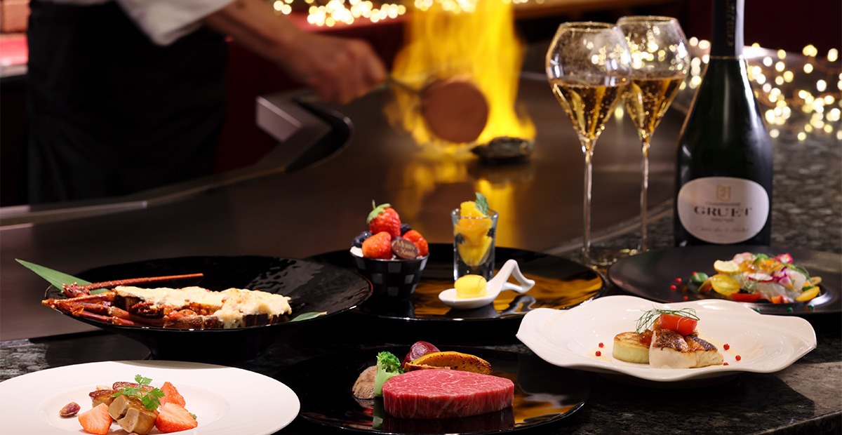 聖夜の煌めきをイメージした華やかなオードブルを皮切りに、フォアグラ、新鮮な海の幸、そして黒毛和牛と、贅を尽くした食材の数々を鉄板で焼き上げる。