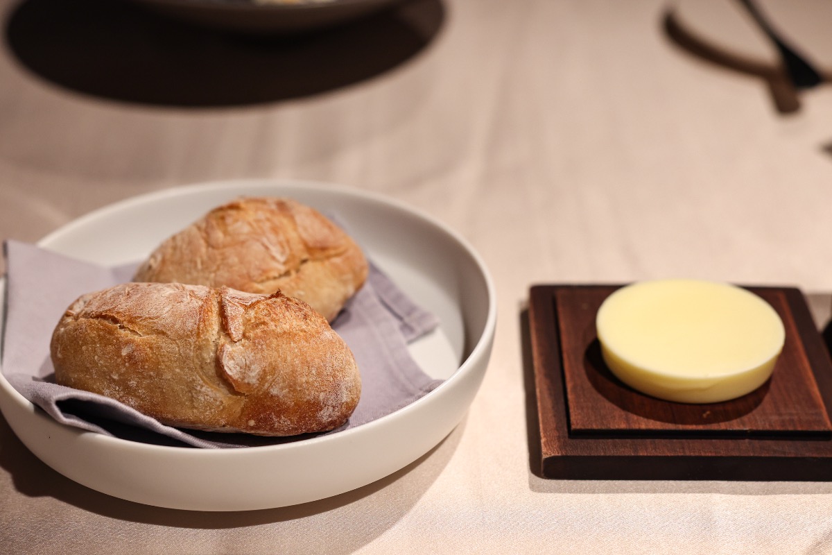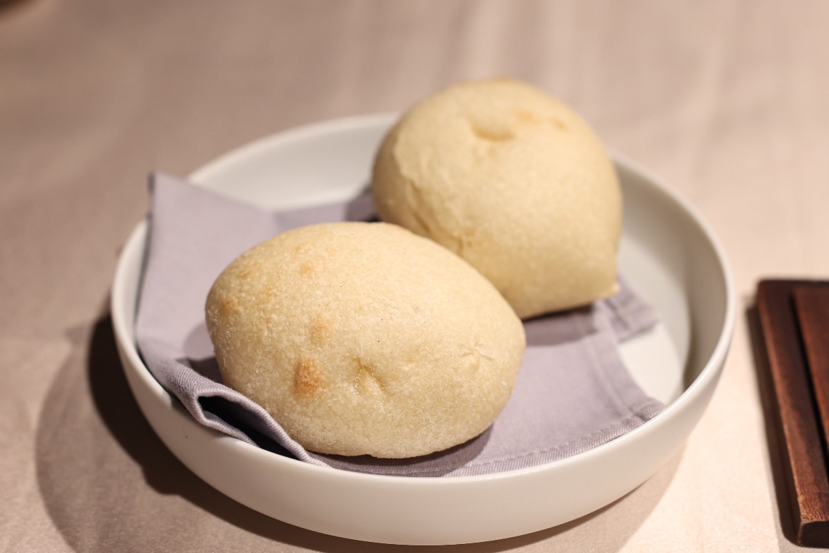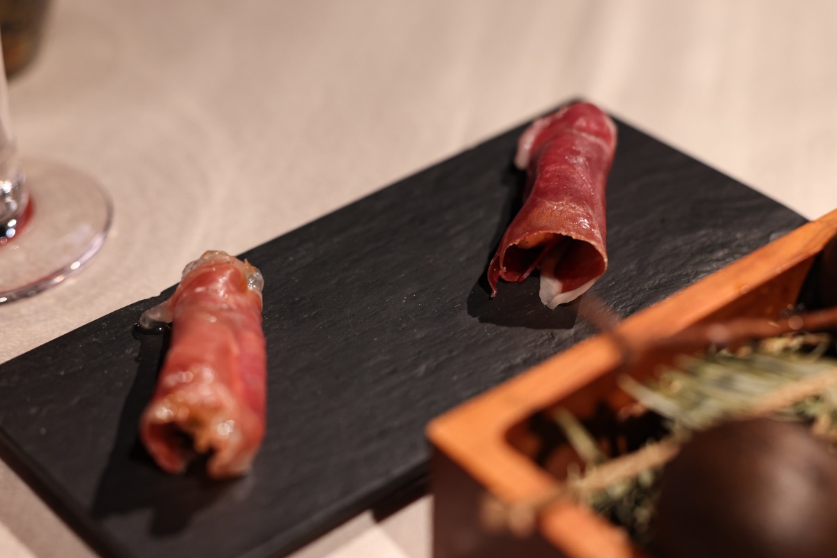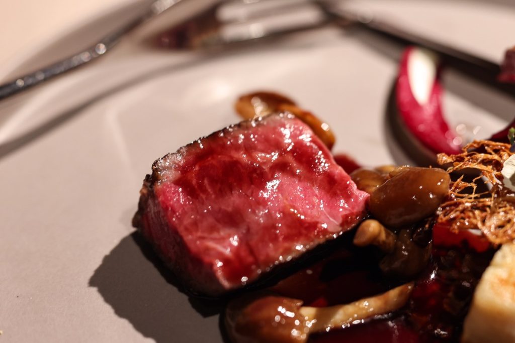 現在九州にて一括管理、育成されている【大和榛原牛】のウチヒラを。赤ポルト酒を煮詰めて作ったソースと、足の長いなめこ、タルティーボという苦味野菜、そして根セロリを薄くスライスして50枚重ねて作った【ドフィノワーズ】グラタン。ドフィノワーズには、ブルーチーズとバターを乗せて焼いてあり、絶品。