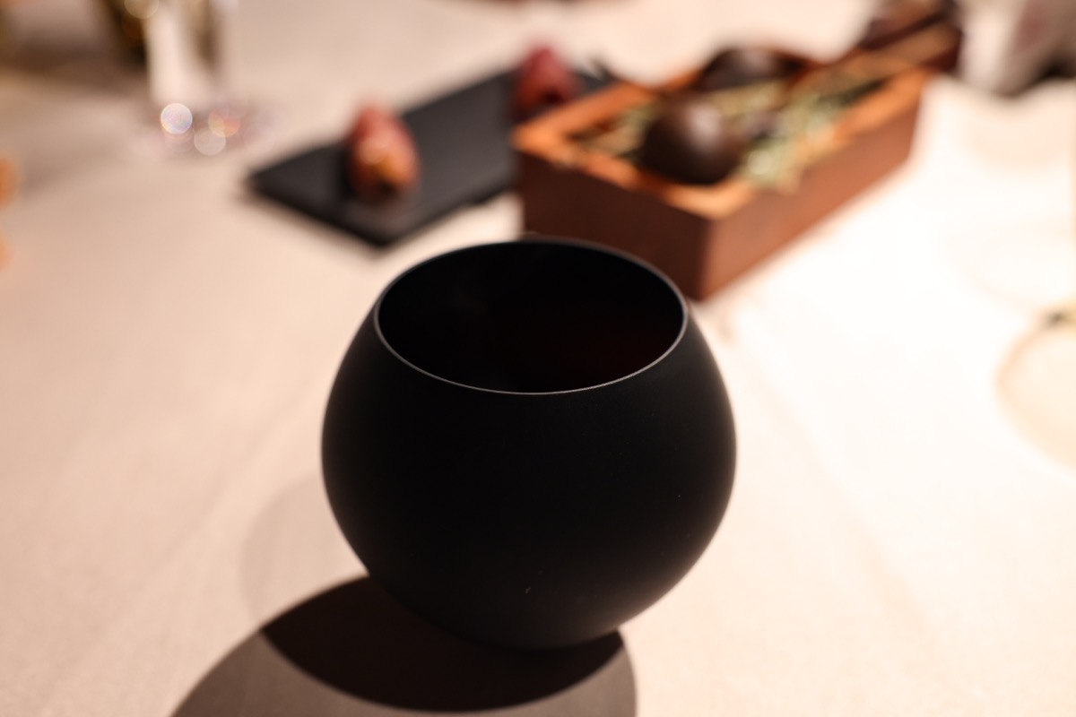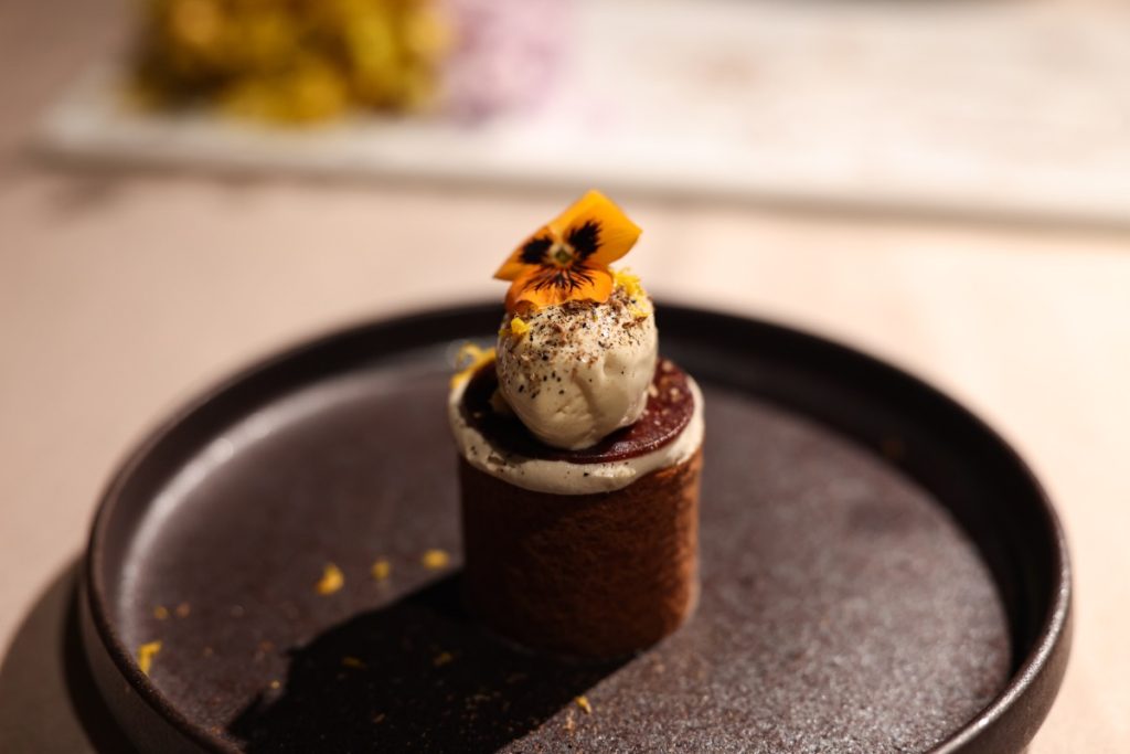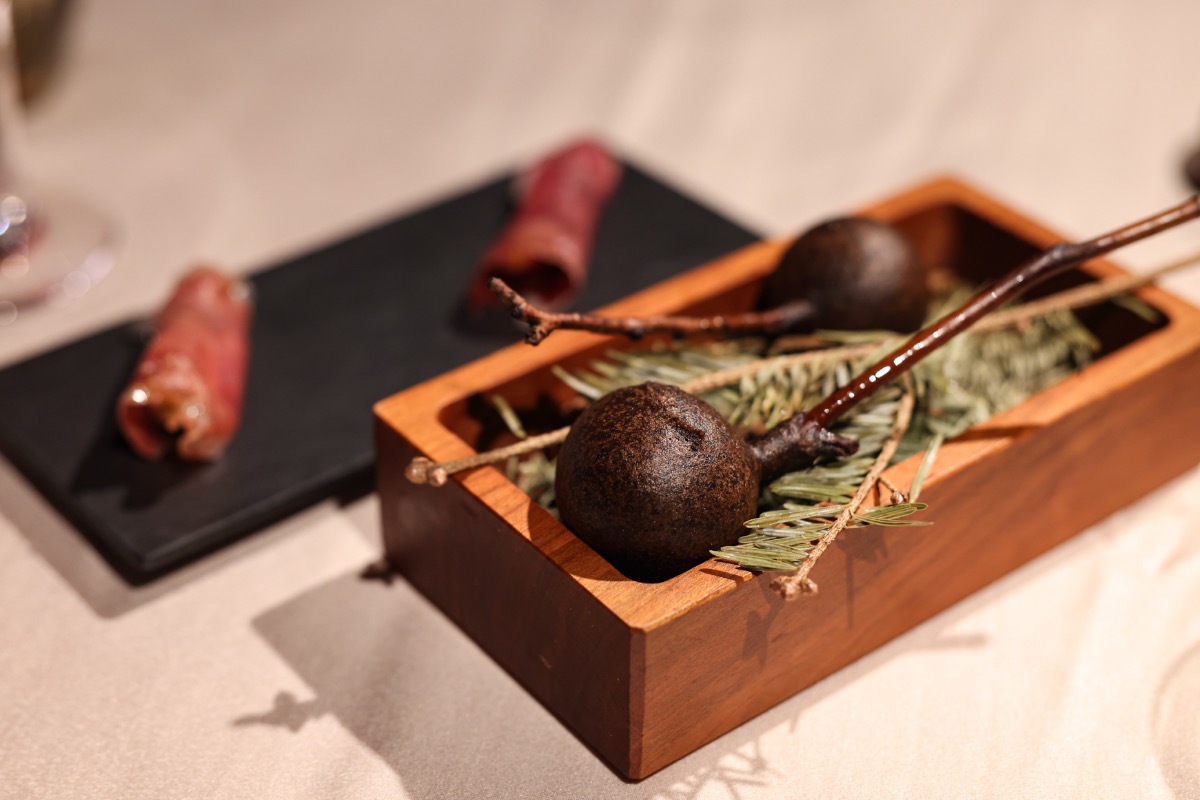 枝の先に刺したフォアグラのテリーヌに、奈良のあんぽ柿のピューレをまとわせ、ブラックカカオの粉をつけてもちっとした食感のパンのように上げたお料理。