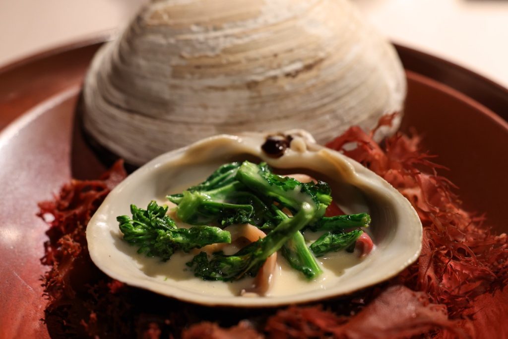 大きな北海道産北寄貝の殻の中に、シャンパンとクリームのソースで火を入れた北寄貝と、西洋の白ネギ【ポワローネギ】