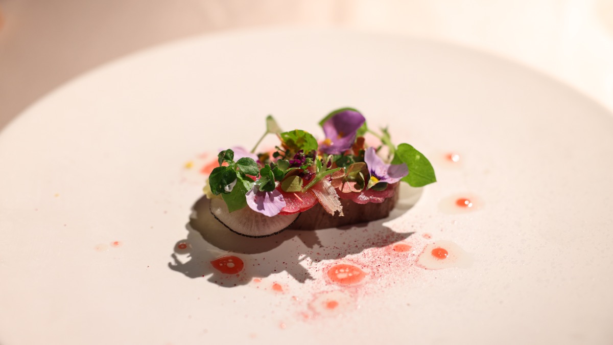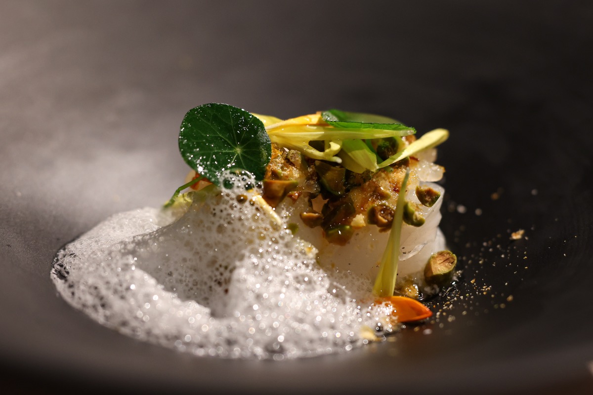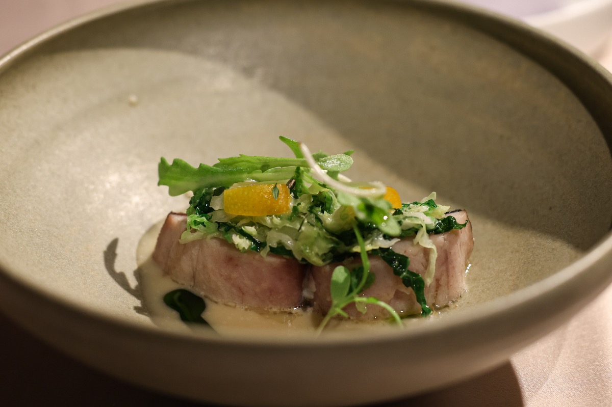 ソースには高農園さんの白菜のピューレを使用し、しまなみ海道、岩城島さんのぽんぽこランドのレモンと、奈良・城(じょう)さんが育てるカラマンシーをふんだんに使った一皿。