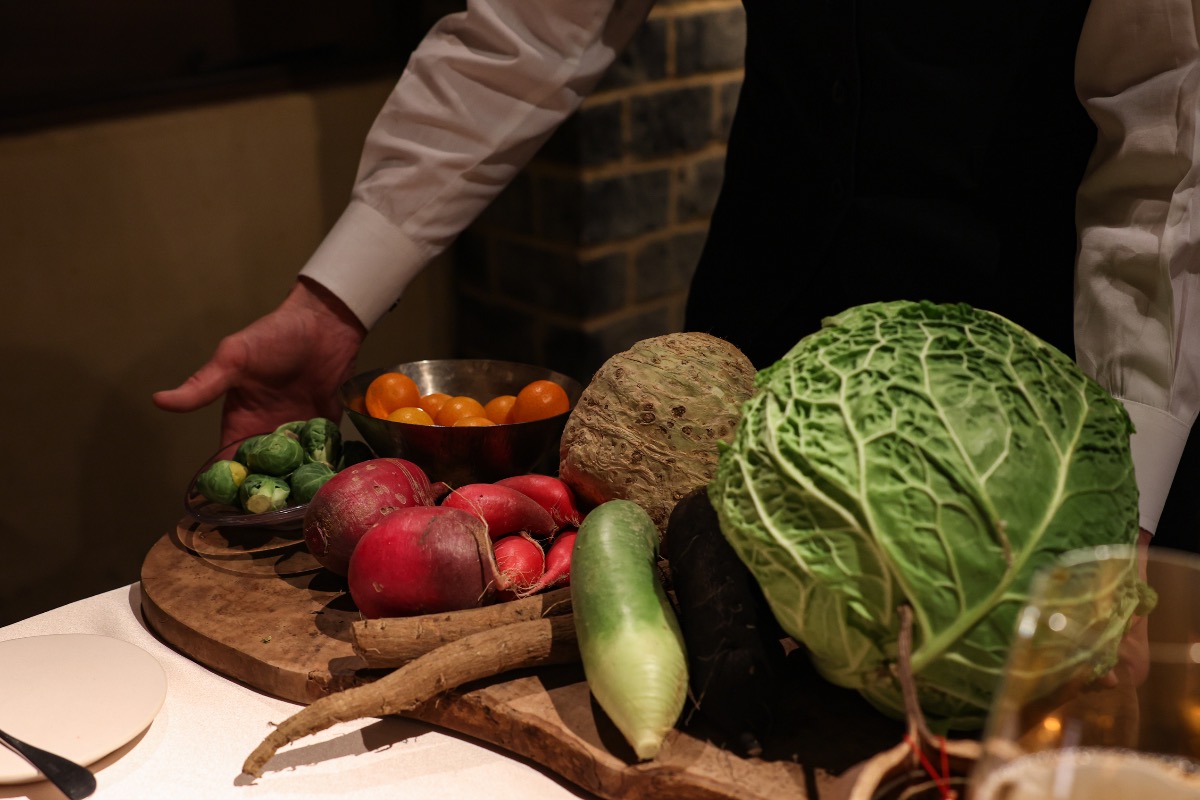 京都のヤマダファームさんのおいしいお野菜と優しい酒粕の香りと甘みのある鰤の油分を愉しめる一皿。
