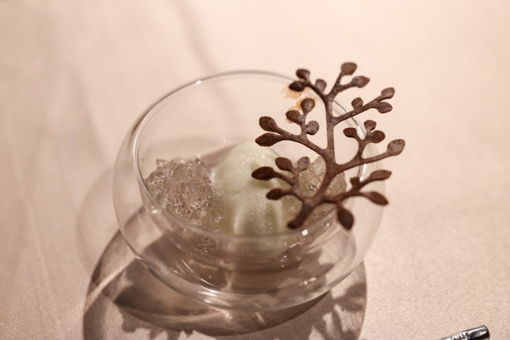 リング状のライ麦のチュイルの中に、白ワインとレモングラスでコンポートした洋梨と、レモングラスの香りを移したほうじ茶のクリームを詰めたデザート。