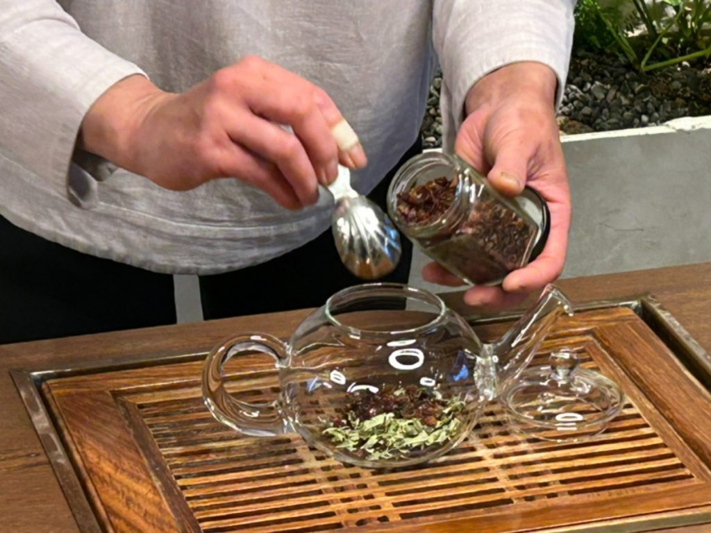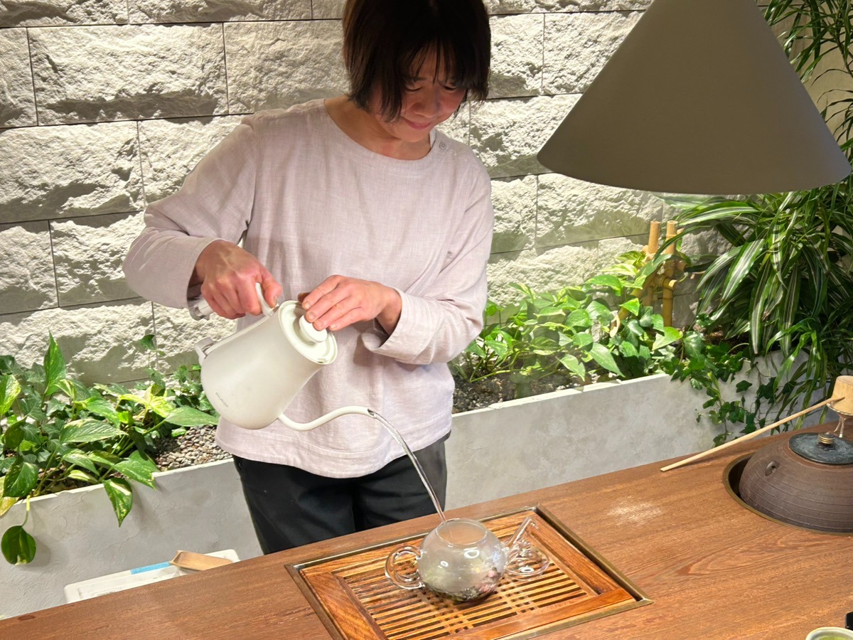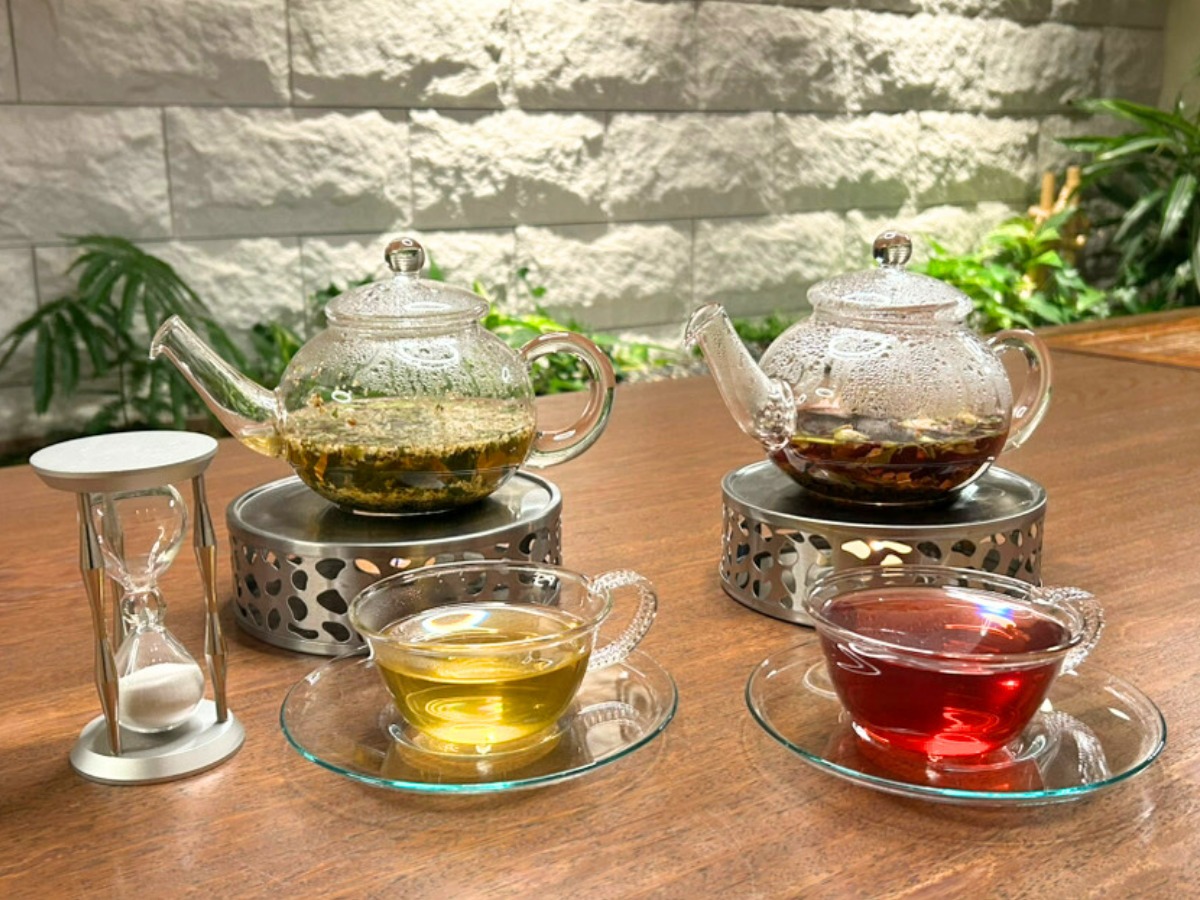 有機栽培のハーブを使用したブレンドティーや大和茶など、五感で楽しむことができる空間を提供している。