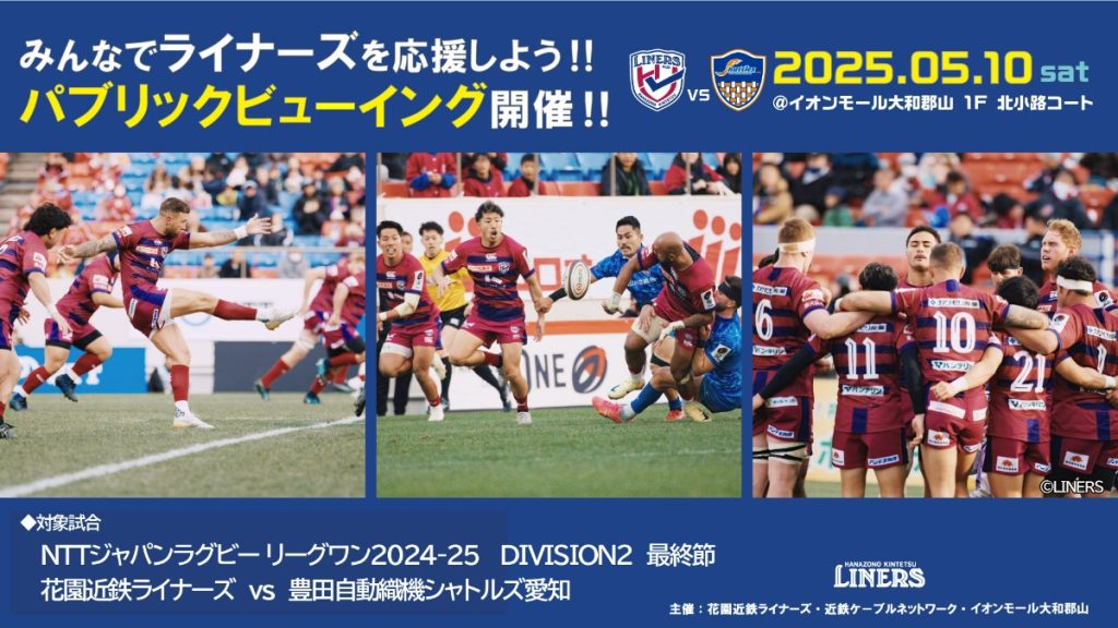 NTTジャパンラグビー リーグワン2024-25 DIVISION2 最終節、「花園近鉄ライナーズVS豊田自動織機シャトルズ愛知」の注目の一戦を、イオンモール大和郡山にてパブリックビューイングで観戦しよう。