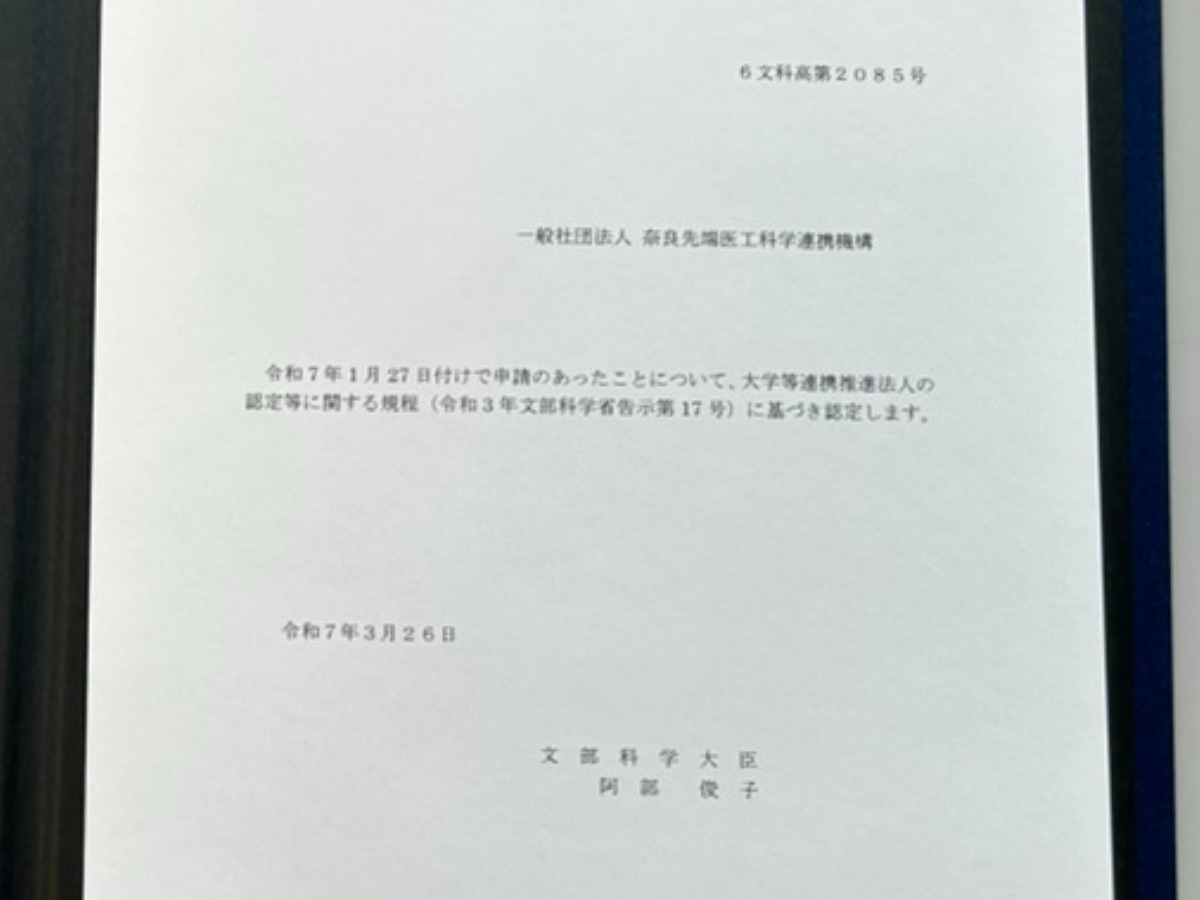 2025年3月26日(水)に『奈良先端科学技術大学院大学』と『奈良県立医科大学』がタッグを組んで設立した、「一般社団法人奈良先端医工科学連携機構 通称:MSTeC NARA(エムステック)」が、正式に「大学等連携推進法人」の認定を受けた。