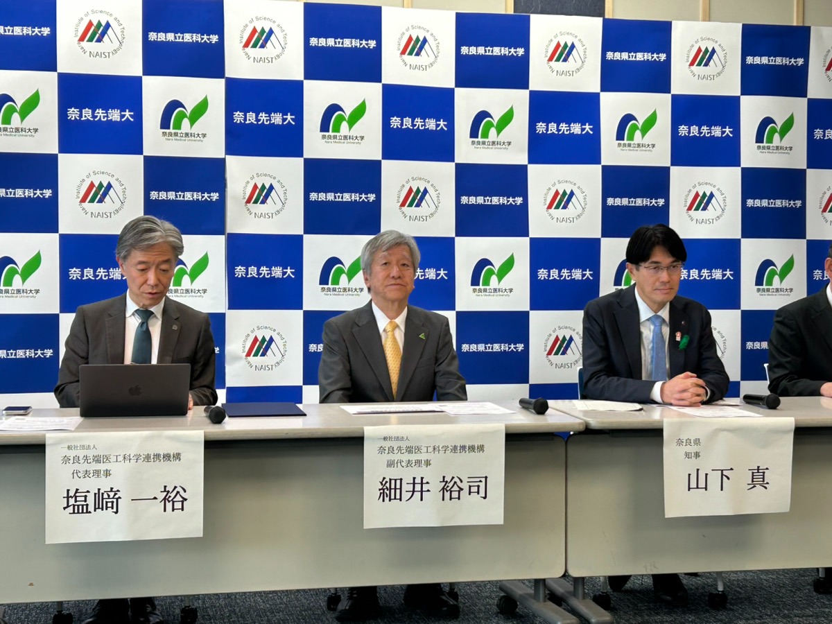 会見には、「MSTeC NARA(エムステック)」の代表理事である塩﨑一裕氏(奈良先端科学技術大学院大学)、副代表理事の細井裕司氏(奈良県立医科大学)、そして山下真知事らが参加。