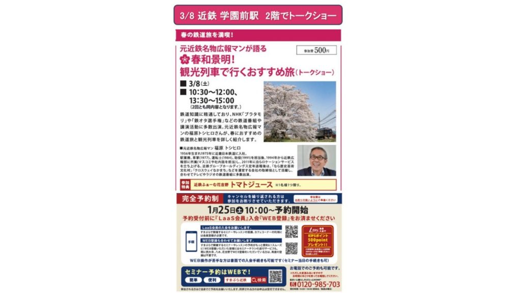 2025年3月8日(土)、近鉄奈良線 学園前駅直結の「住まいと暮らしのぷらっとHOME(学園前)」にて、元近鉄名物広報マン・福原トシヒロ氏による観光列車の魅力を語るトークショーが開催される。